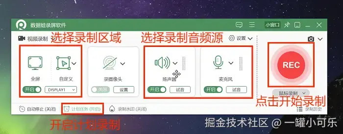 步骤2:选择需要录制的区域,设定好录制的音频源后,还可以设定计划录制功能。一切准备就绪后,点击 “REC” 开始录制就可以了。