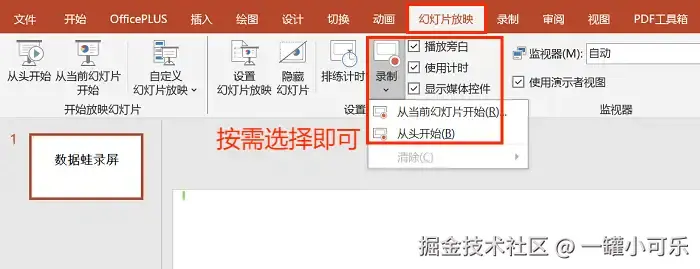 步骤2:找到 “录制” 并下拉,按需选择从哪张幻灯片开始录制就可以了。录制好的视频会直接插入在当前幻灯片中,也可以选择另存需要的位置。