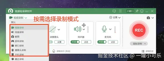 步骤1:下载并打开该软件,在页面的左上角选择需要的录制模式,本文以 “视频录制” 为例。