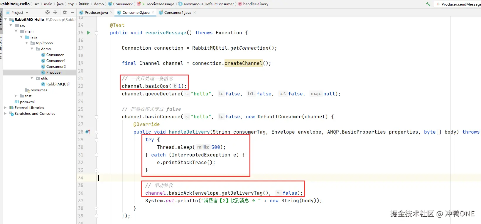 接下来改造消费者2用来模拟一下某一个消费者消费慢的情况下会怎么样,改造之后的代码如下: