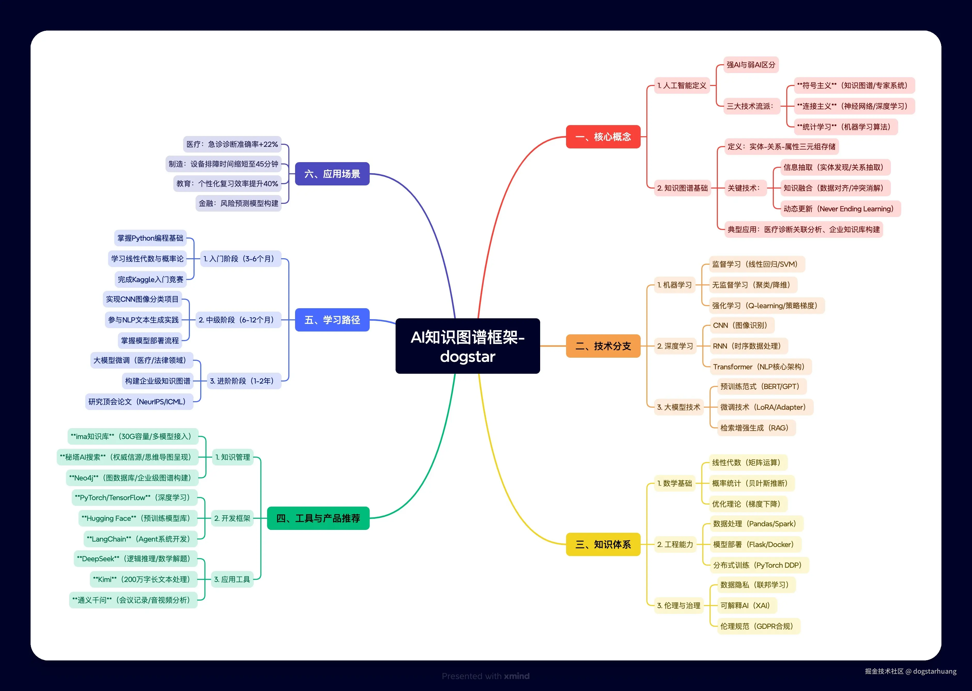 最近在疯狂自学AI,不知道自己还有哪些知识点不知道的。为此,我让AI、Deepseek、元宝、秘塔 帮我整理了这份AI学习的笔记,顺便分享给大家和需要的同学。主要让AI帮我整理一份AI知识图谱,把全部有关AI的概念、知识、理论体系等 ,都涵盖进来。方便我这种AI小白能也全盘知道有哪些知识点,以及学习的路径。包括目前流行的软件产品工具网站 都有哪些推荐?