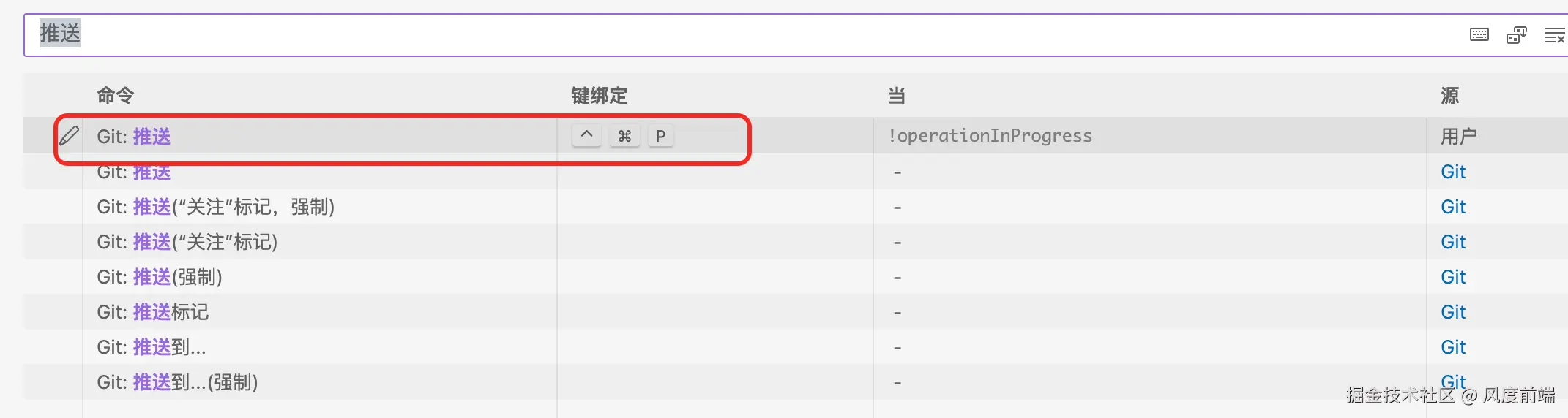 完成了本地仓储的提交,下面一步就是提交到远程仓库,这一步骤 vscode 没有默认的快捷键,但是内置的源代码管理器却提供了相关的命令,所以我们只需要给给相关的命令绑定快捷键就行,同样的打开vscode 键盘快捷键配置,搜索推送,看到Git:推送这个命令就是我们想要的结果,设置快捷键⌘ + ⌃ + p。这样设置的原因是,p代表了push的含义,而且⌘ + ⌃的修饰符组合也和第二步骤保持了一致,使得整个操作的快捷键记都非常统一,且易于记忆。