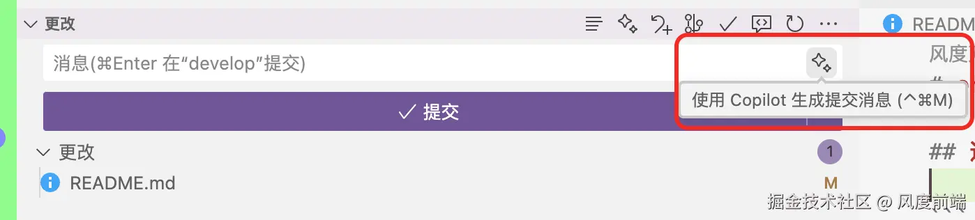 安装完成后我们再使用⌘ + ⌃ + g来切换回源代码管理器,就可以看到在输入框的右侧多了一个小✨的小图标,点击后就会调用github copilot提供的智能生成commit信息功能: