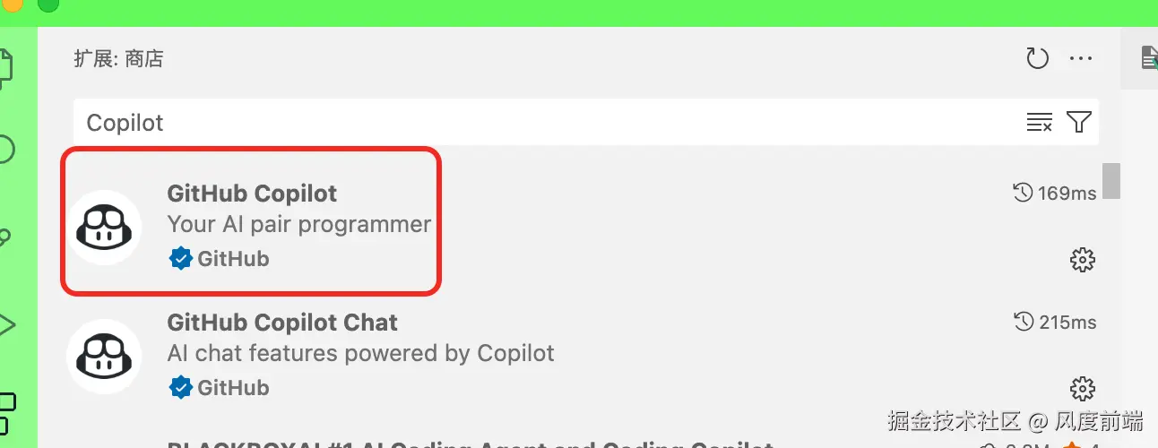 使用⌘ + ⇧ + x切换到扩展,进入 vscode 扩展商店,搜索Copilot,安装GitHub Copilot,不需要配置,登录自己的github账号就行