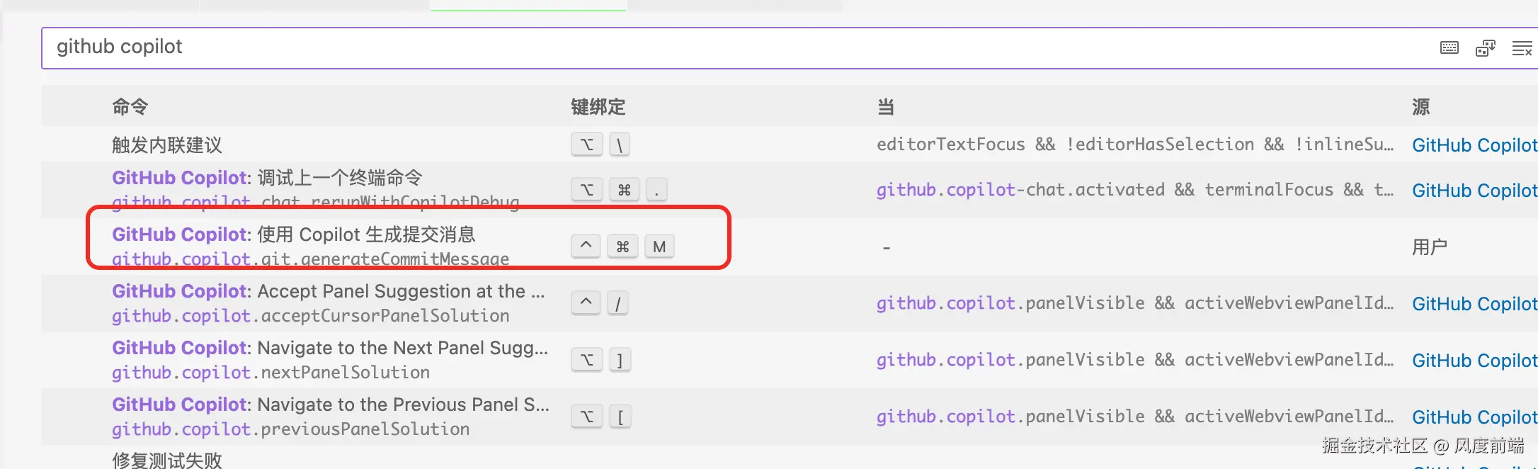 打开 vscode 键盘快捷键配置(不知道怎么进入的,可以看我往期文章),搜索:github copilot,第三个就是我们的目标匹配结果,为其设置快捷键⌘ + ⌃ + m,之所以如此设置,是因为m代表了message的含义,表示我们使用这个快捷键来生成提交信息,⌘+⌃的修饰符组合,也不会与其他快捷键冲突,这个快捷键配置可以放心食用。