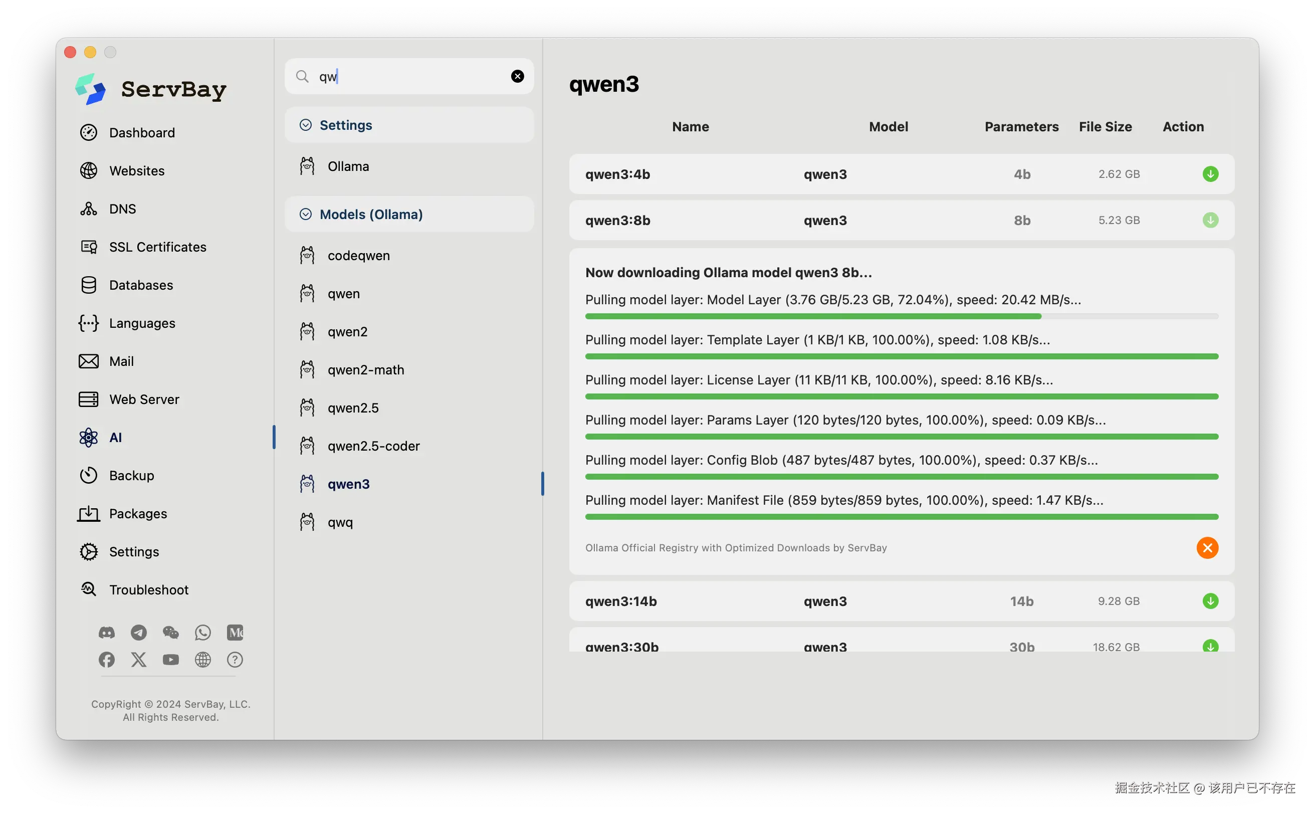 - 找到Ollama,ServBay支持了最新版本的Ollama 0.7,直接点击需要的版本下载即可