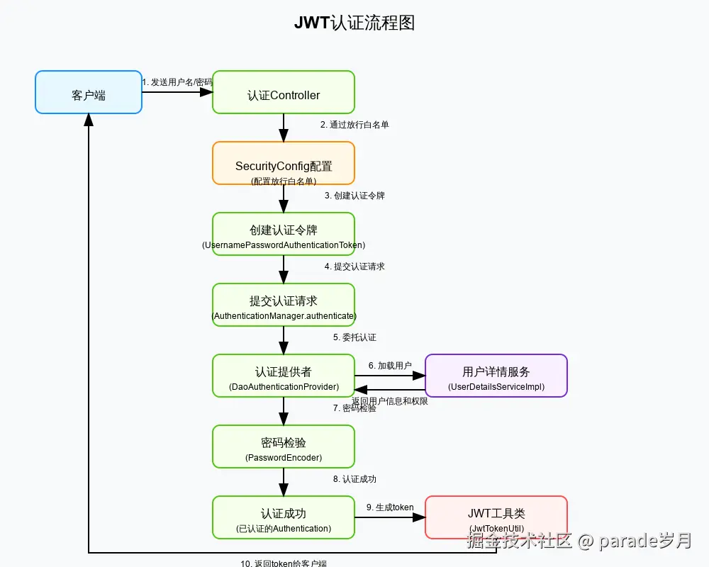//1. new UsernamePasswordAuthenticationToken(username, password)创建一个“未认证”的 Authentication 对象包含principal:用户名,credentials:密码,authorities:null示未认证