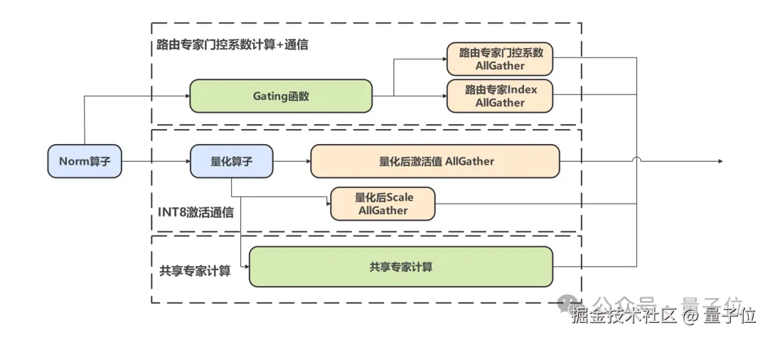 通过 Gate 函数计算与 AllGather 通信的解耦,结合共享专家的数据并行(DP)策略,利用昇腾多流机制实现计算与通信的并发执行,最大化硬件利用率;