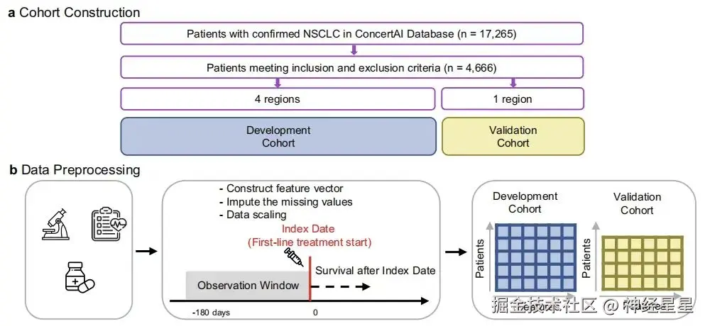 如下图所示,该研究选取 2015 年 1 月至 2023 年 1 月经组织学确诊的非小细胞肺癌(NSCLC)患者(n=17,265)构建回顾性、观察性队列,经纳入 / 排除标准及剔除缺乏有效总生存期(OS)记录患者后,4,666 名患者纳入研究,患者由 104 维向量表示,维度包含人口统计学信息、实验室检查等多方面变量。