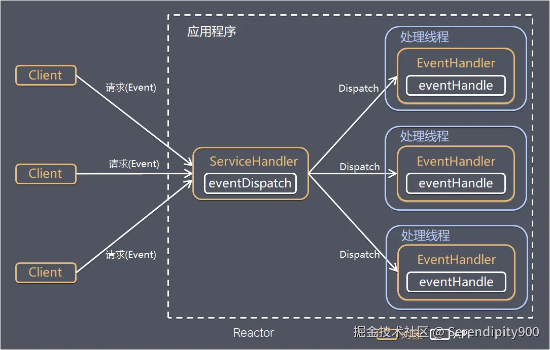 在Reactor模式中,事件分发起等待某个事件或者可应用某个操作的状态发生,事件分发起就把这个事件传给事先注册的事件处理函数或者回调函数,由后者来做实际的读写操作。如在Reactor中实现读:注册读就绪事件和相应的事件处理器、事件分发器等待事件、事件到来,激活分发器,分发器调用事件对应的处理器,事件处理器完成实际的读操作,处理读到的数据,注册新的事件,然后返还控制权。
