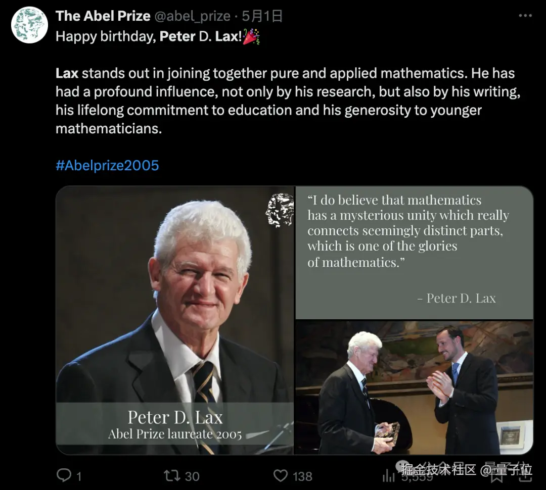 值得一提的是,今年 5 月 1 日拉克斯刚刚过完他 99 岁的生日,阿贝尔奖官方亲自发文祝贺,并给予了这样的评价: