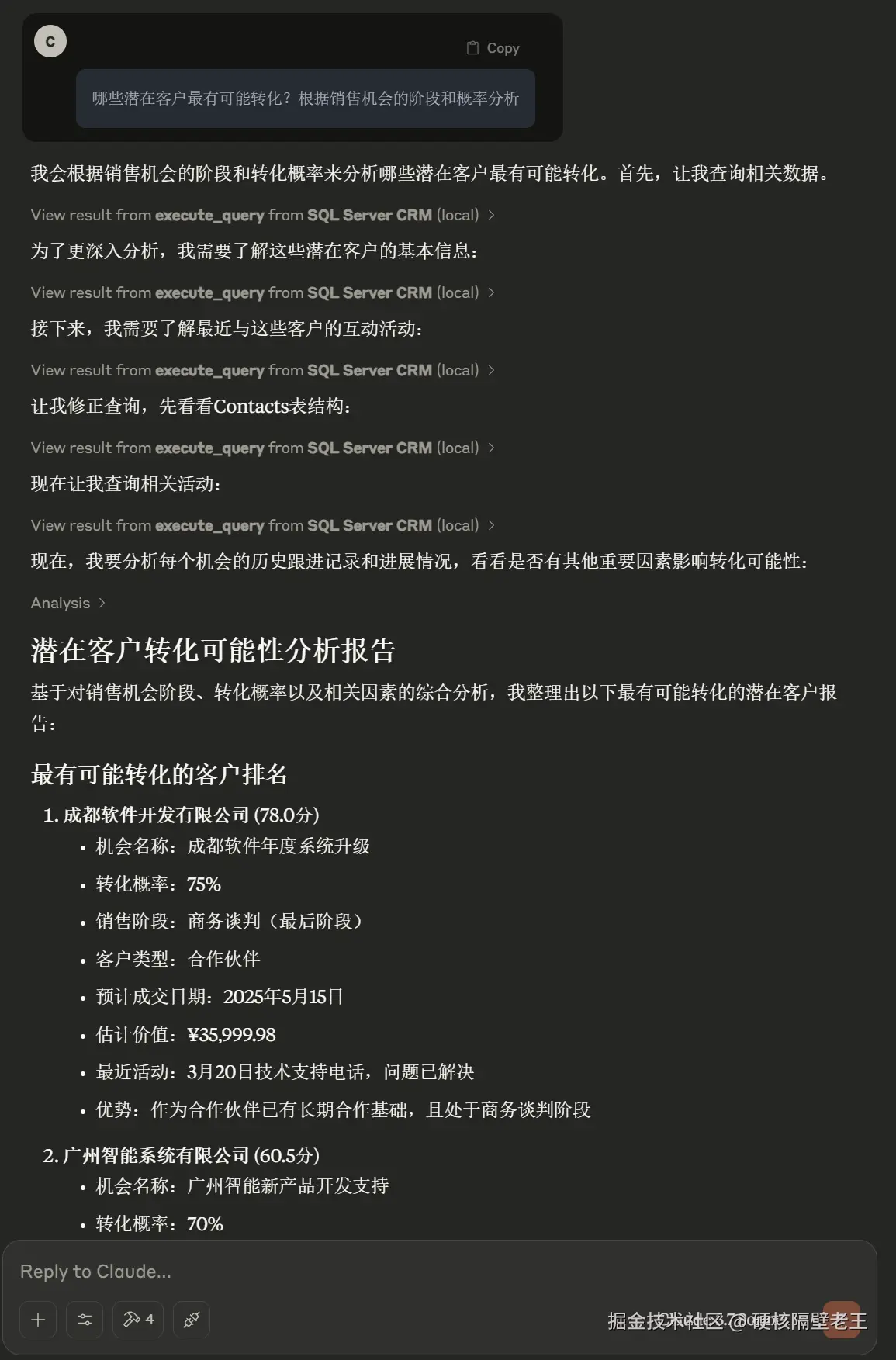 本文将探讨MCP的基本原理、技术架构以及实际应用场景,通过一个连接SQL Server CRM数据库的实例,展示MCP如何显著增强大模型的业务分析能力,将企业现有系统与AI无缝融合。