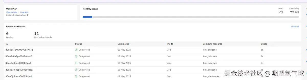 参考文档随手写个小程序,通常2-3秒就能跑完。比如搞个量子随机数生成器,再跑个量子电路模拟。只用了几秒钟的额度,免费额度对普通人来说完全够用,根本不用担心排队。每次提交任务,几秒钟就能拿到结果,效率很高。