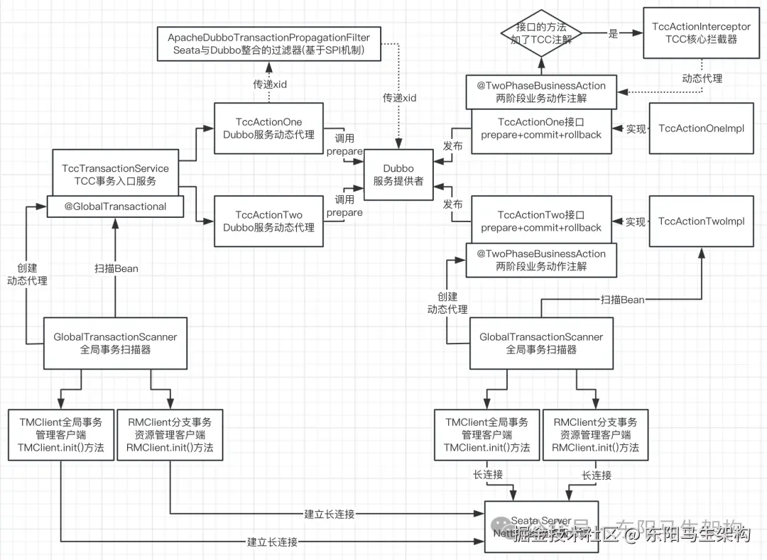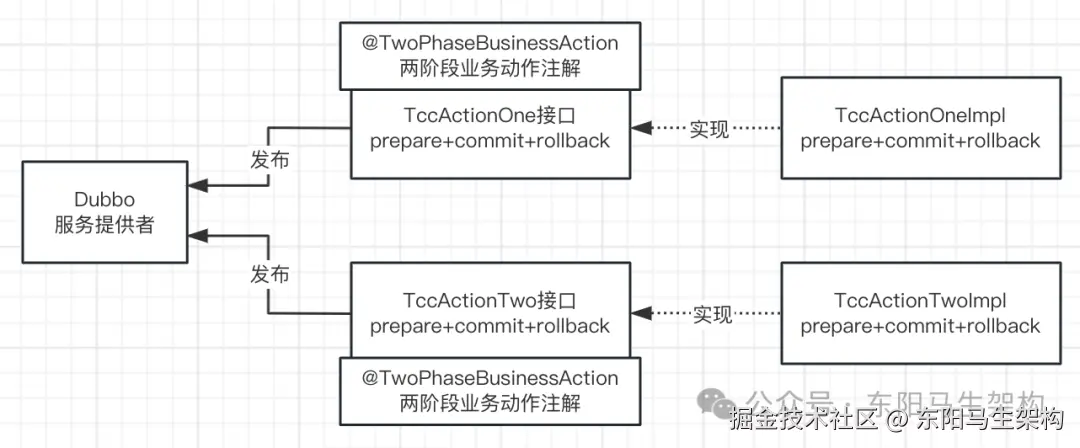 这两个TCC事务参与者均是Dubbo远程服务。一个应用作为服务提供方,会实现这两个TCC参与者,并将它们发布成Dubbo服务。另外一个应用作为事务发起方,会订阅Dubbo服务,然后调用编排TCC参与者,执行远程Dubbo服务。