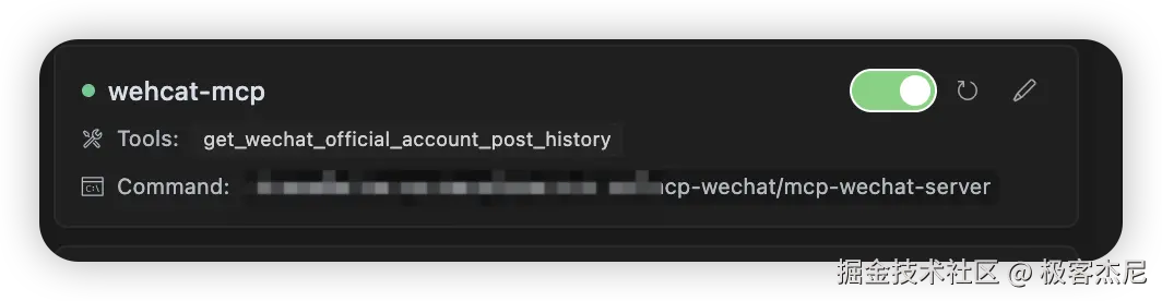 这里跳过调试/编译/配置等步骤,感兴趣的朋友可以看看我上一期的文章,有需要开发好的 MCP Server 源码的朋友后台回复“微信MCP”即可。
