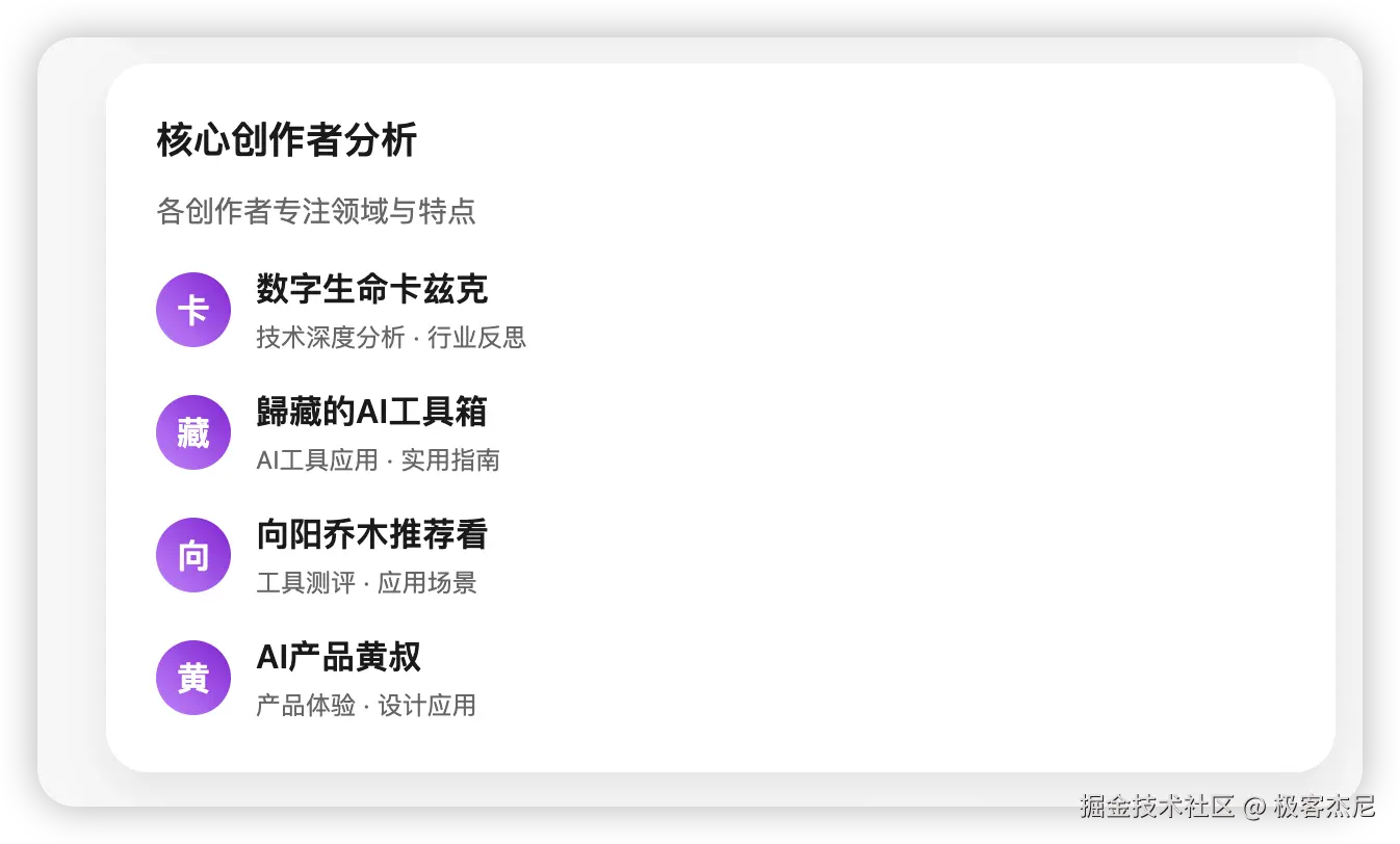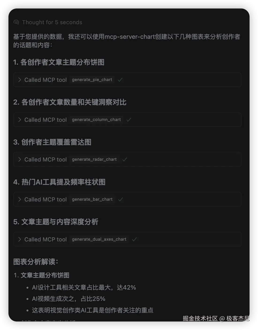 分析热门创作者的文章数据,调用 mcp-server-chart ,请深度分析我提供的数据,生成多个合适的可视化图表,包括但不限于词云,主题分布,AI工具提及频率等核心指标,能够帮我分析这些创作者的话题和内容趋势。