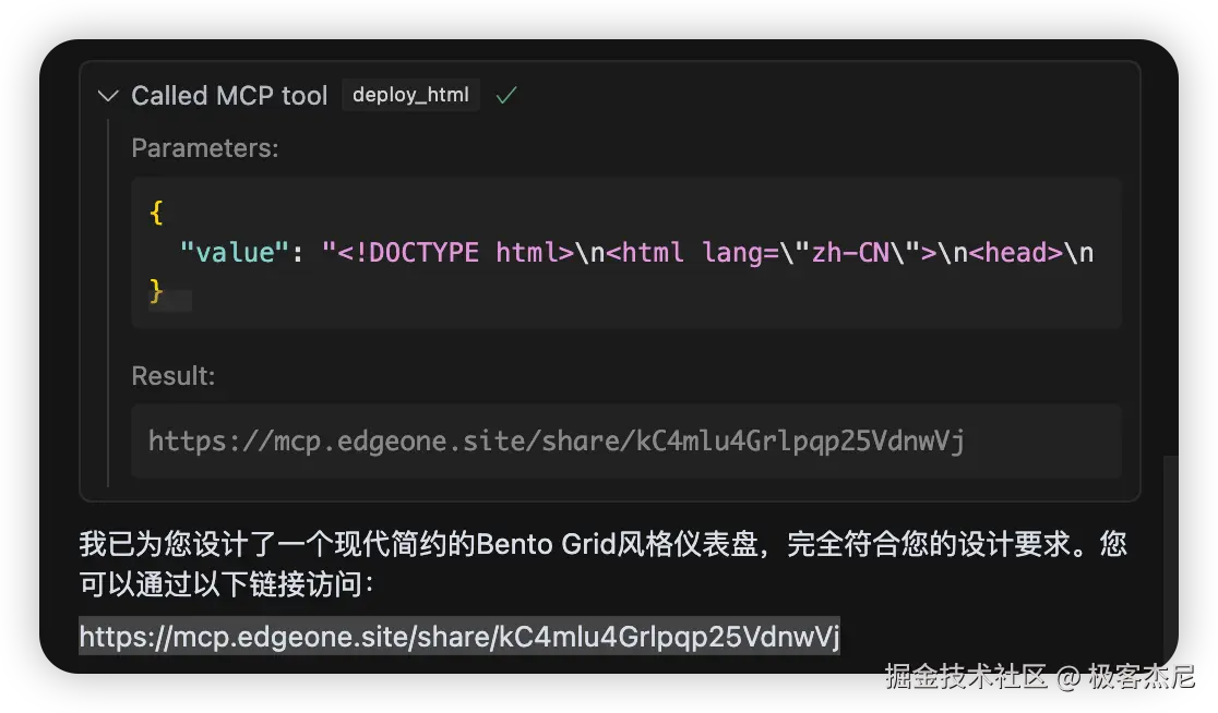 由于之前早已经配置到 edgeone-pages-mcp 服务,Cursor 在完成网页制作后,自动化调用了 deploy_html 工具能力,实现了一键部署,效率拉满。