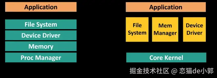 所以如下图,和 Linux 的宏内核(左)对比,微内核架构大部分实现其实在用户态: