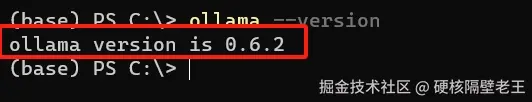 验证安装是否成功:打开命令行(WIN+R,在运行中输入cmd后回车),输入ollama --version,如果命令执行成功,并输出了版本信息,说明安装成功了。