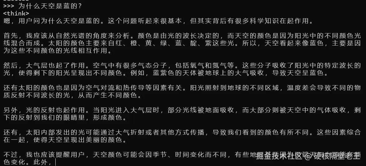 恭喜你已经在本地成功安装了第一个私有大模型。运行成功以后,我们可以直接在命令行和deepseek对话。