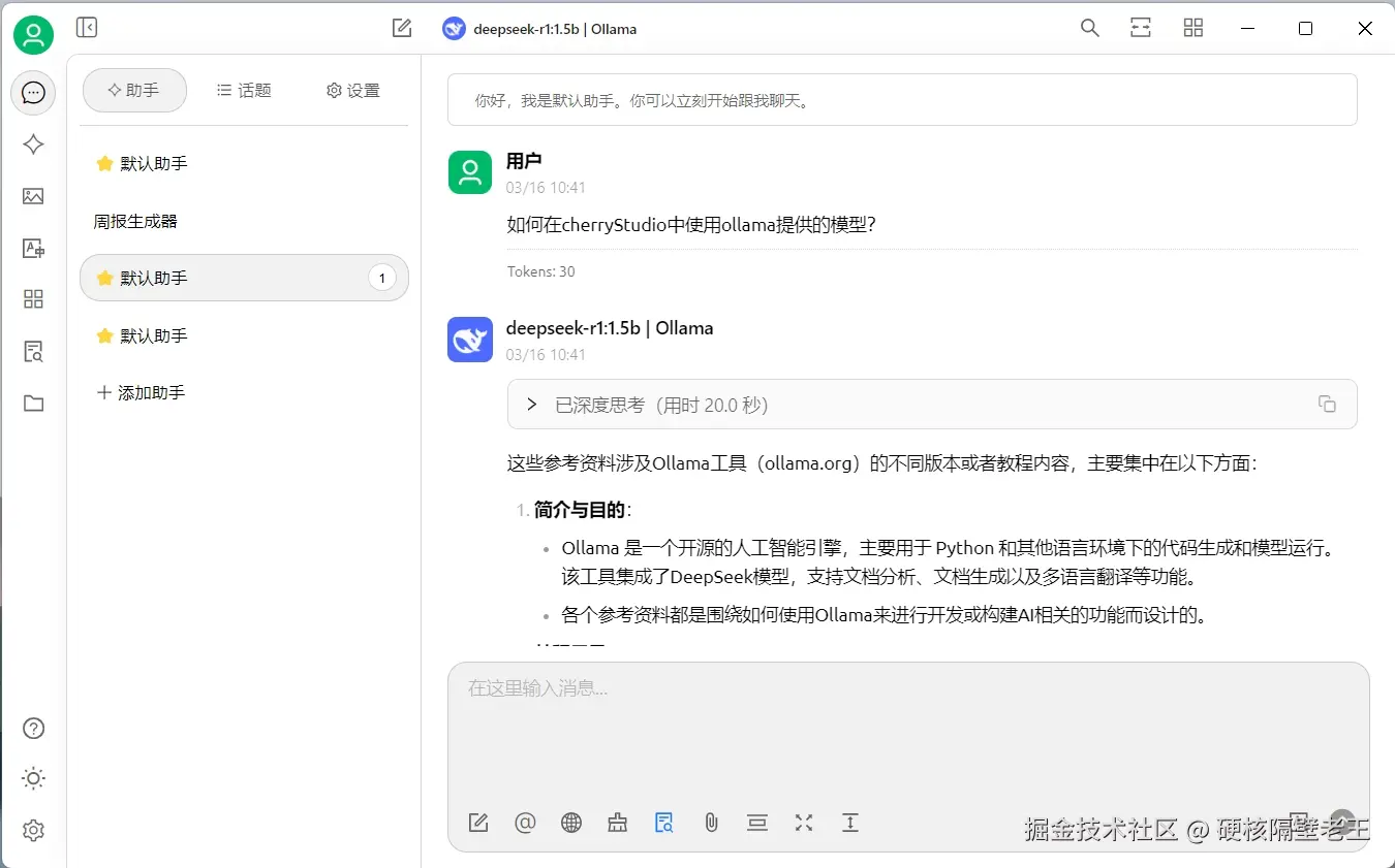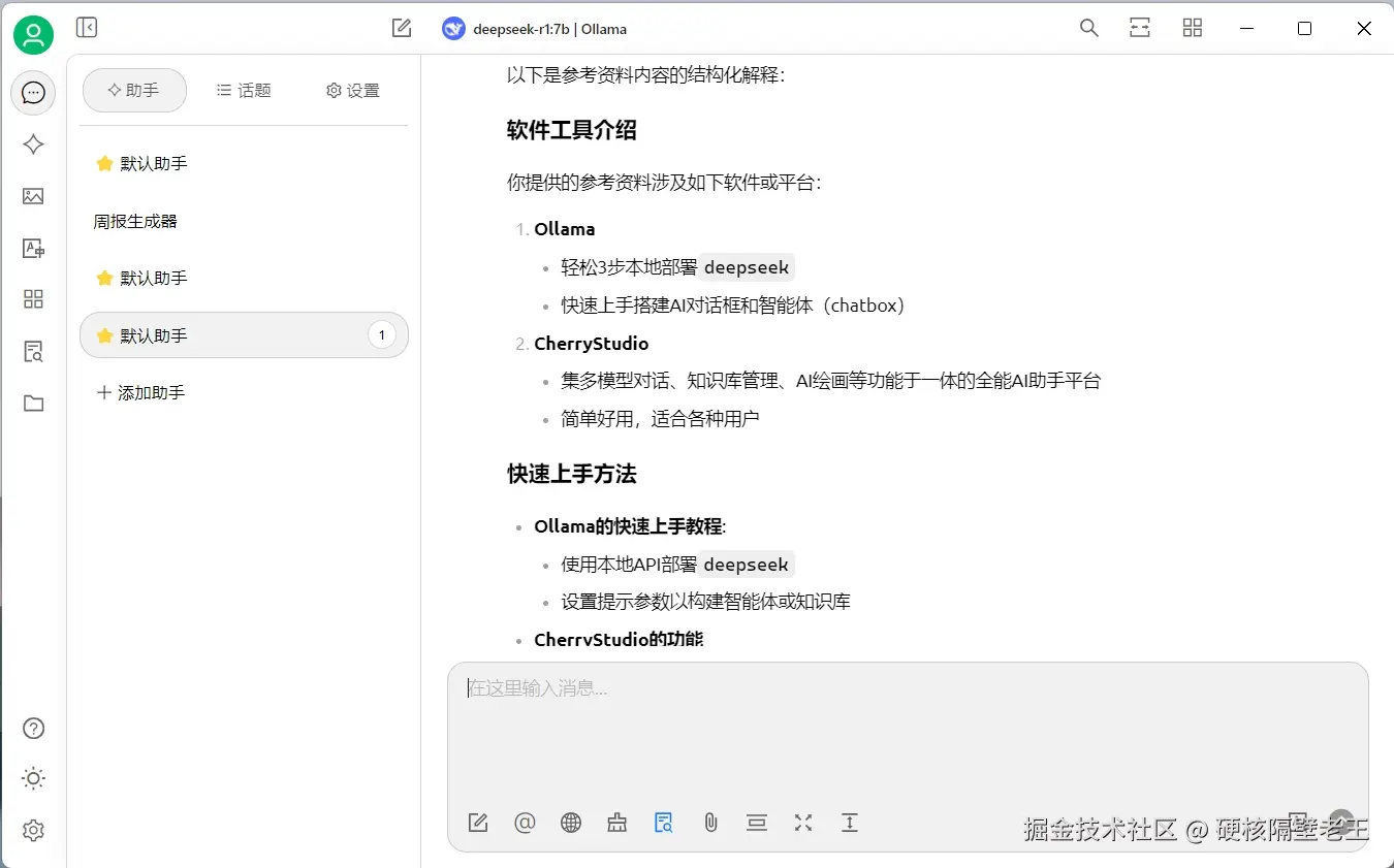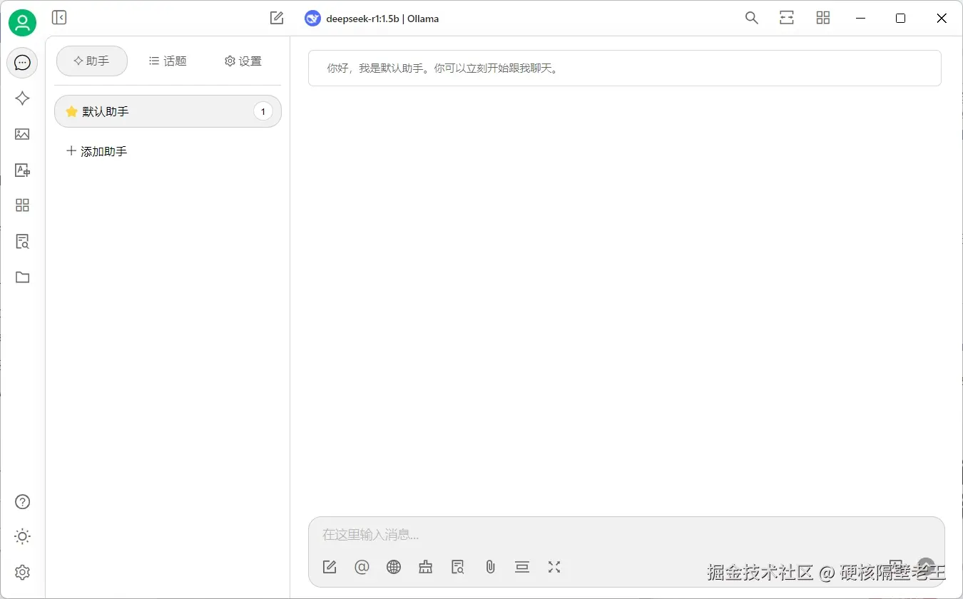 恭喜你,完成这一步骤,我们就已经成功的将ollama和cherryStudio集成到了一起。接下来让我们试试创建智能体吧。