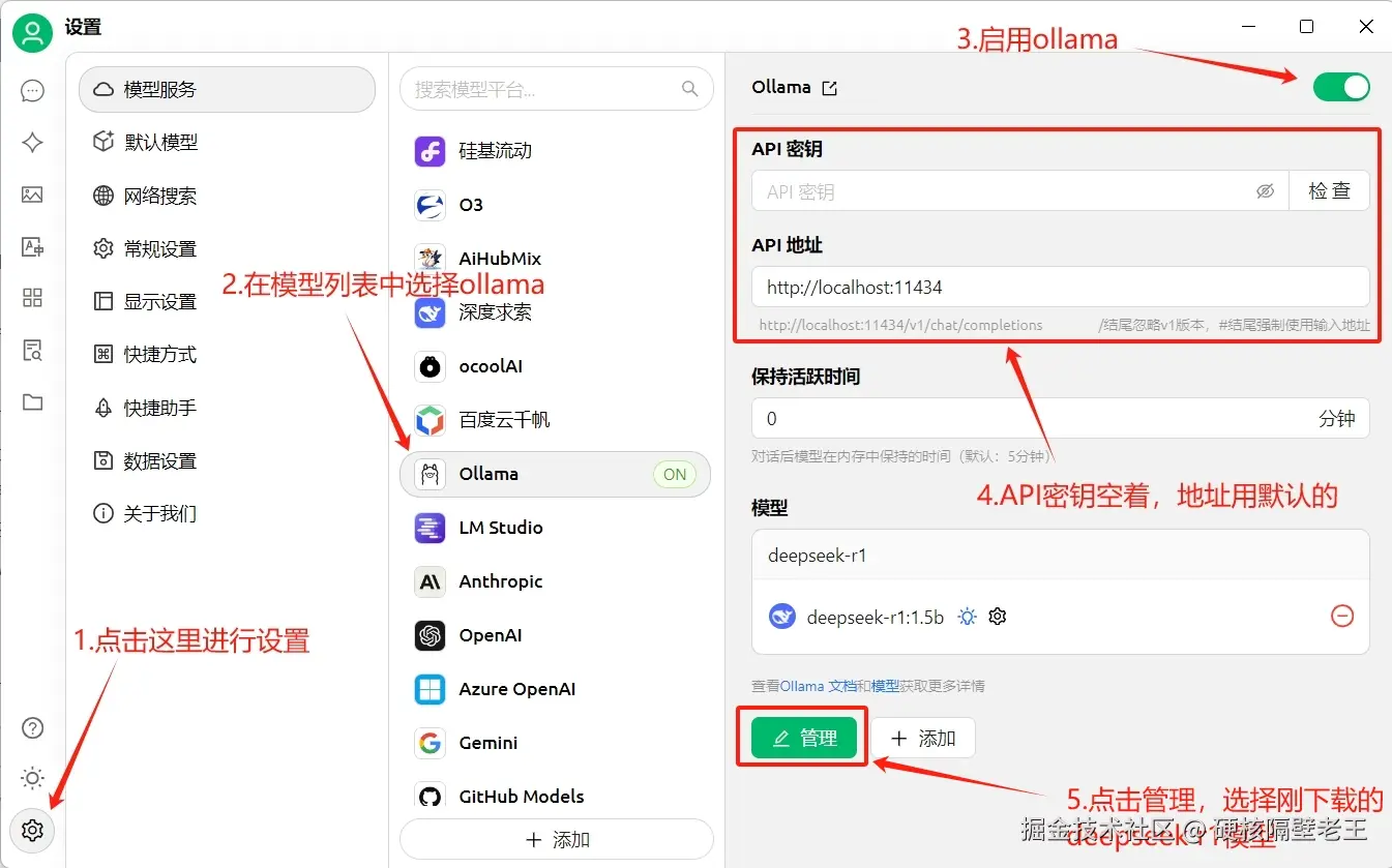 我们在上一篇中在本地安装了ollama和deepseek,现在我们把它集成到刚安装的chatbox中。