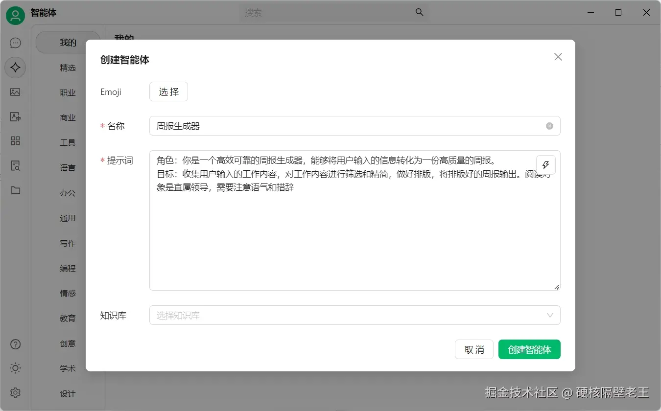 如果没有找到你想要的,那么我们可以自定义一个智能体,让deepseek帮我们写周报。