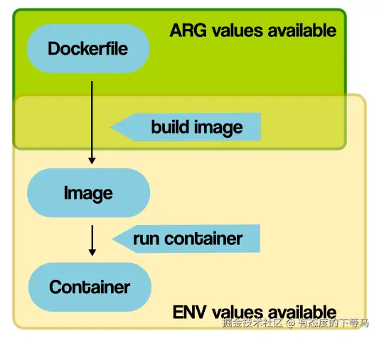ARG用于镜像构建阶段 build_time, 用于给构建提供外部变量, ENV用于将来运行的容器 runtime。