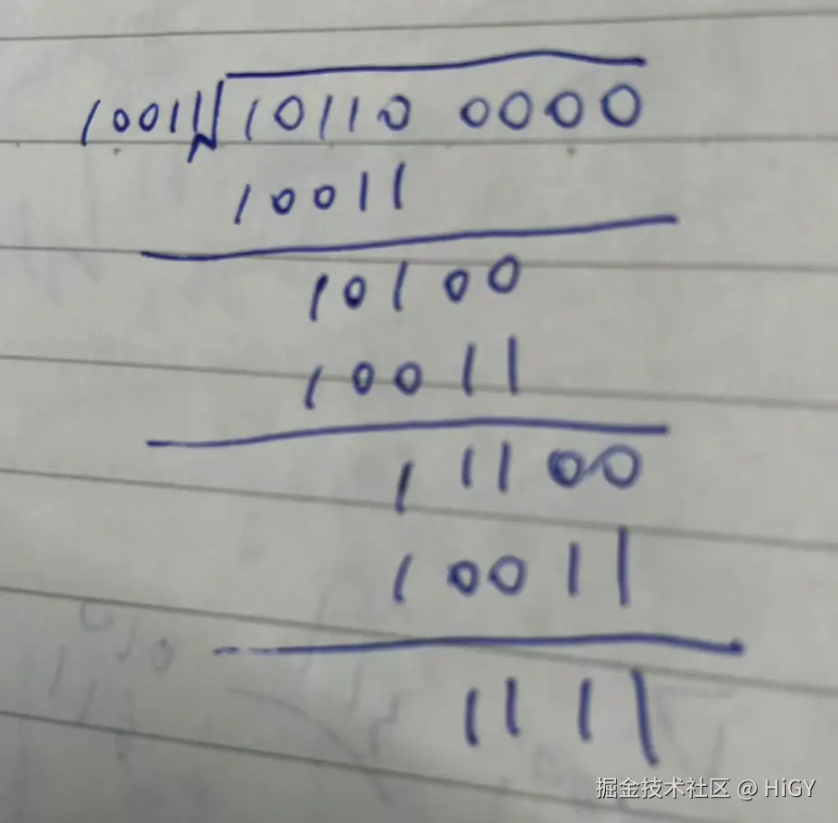 - 第二步生成的串和第一步生成的除数进行模 2 除法运算(不进位也不借位的除法运算),即 10110 0000 / 10011