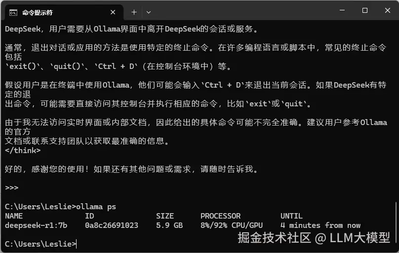 若要停止模式运行,可输入 ollama stop deepseek-r1:7b。