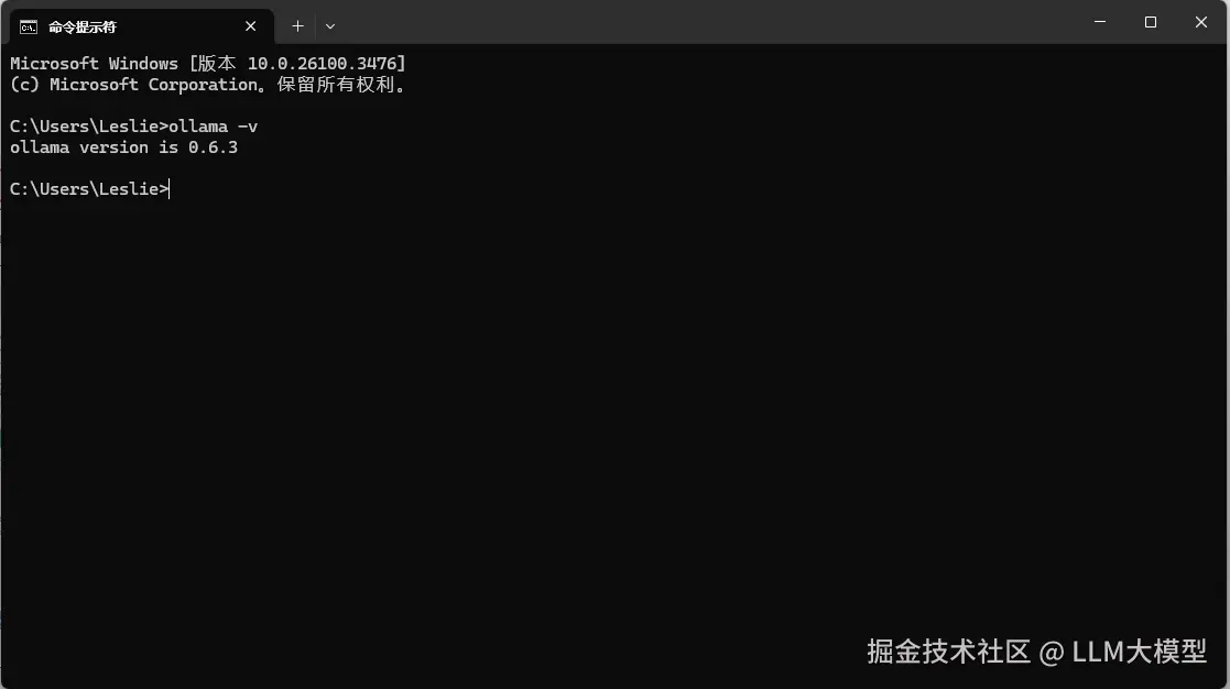 完成设置后,点激 Ollama.exe 按钮,然后在命令提示符中输入 ollama -v,见到 ollama 版本号代表安装成功。