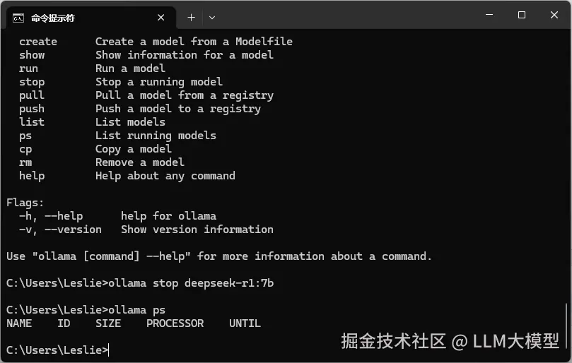 停止后再输入 ollama ps,可以知道停止命令是否成功