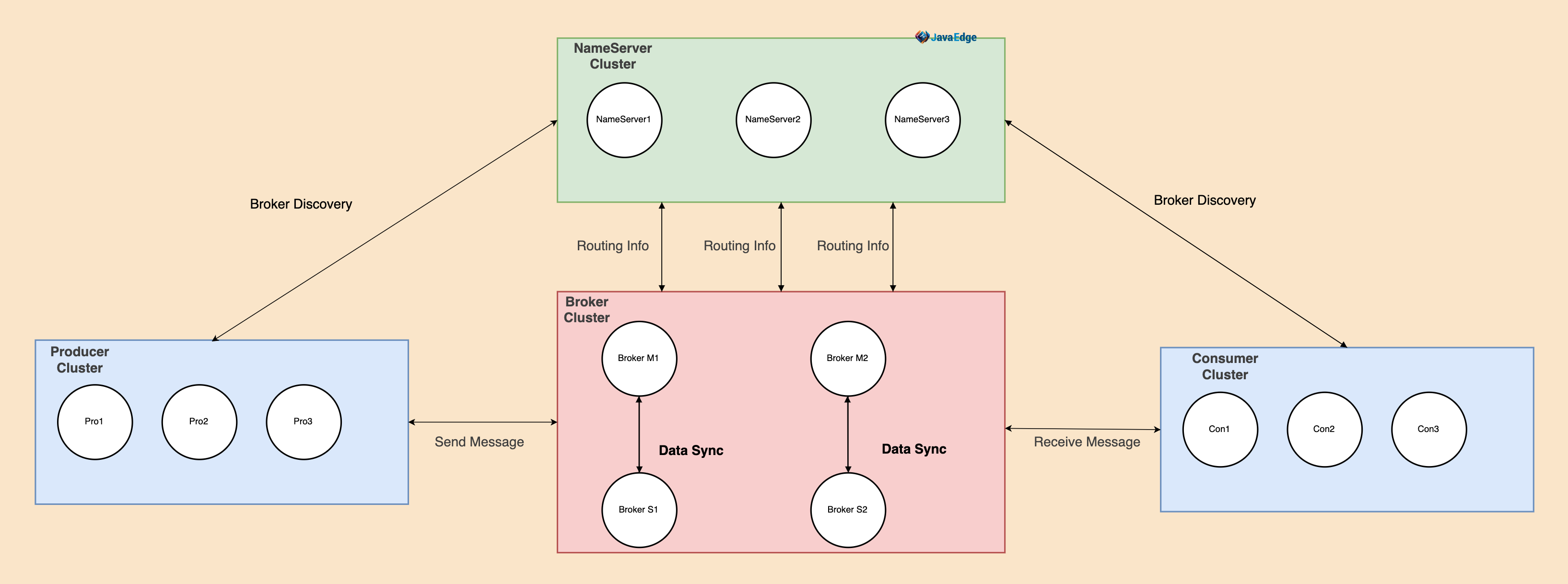 每个 NameServer 节点都可独立提供服务,因此对于client(Pro和Con),只需选择任一 NameServer 节点来查询路由信息即可。