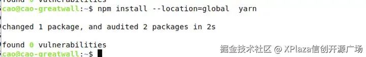npm install --location=global yarn #安装yarn,也可以直接在后续只用npm install,但yarn的机制更先进,后续就以yarn为主了。