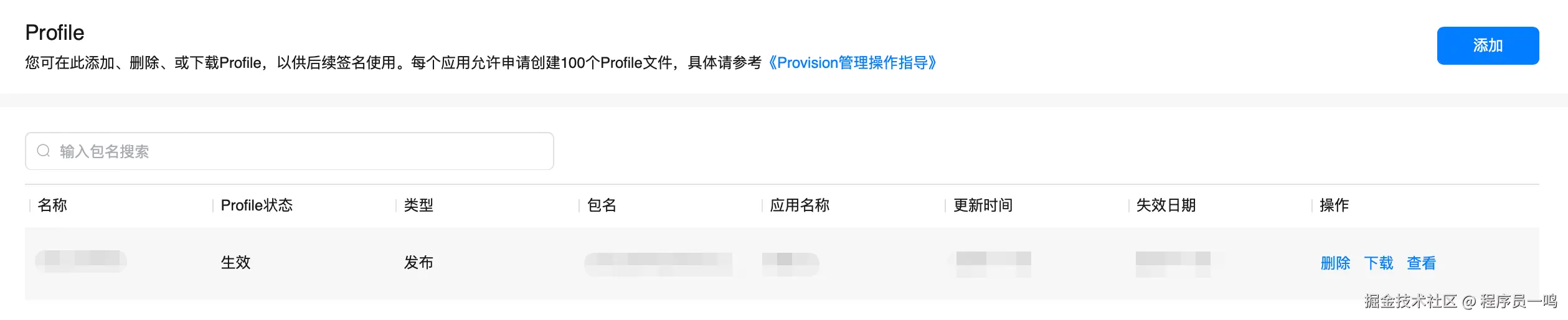 选择证书,直接选择第三步中申请的发布证书即可,信息填完之后,点击右上角的添加按钮,在列表之中,就可以查看到已经创建好的证书了。