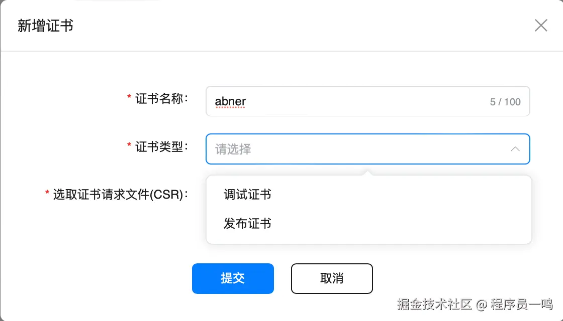 点击新建证书之后,会进行填写证书的信息,按照需要,你可以创建发布或者调试证书。