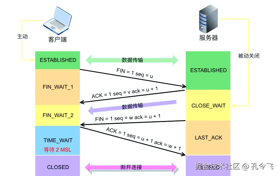 FIN_WAIT_1 状态解析: 该状态表示客户端正在等待远程 TCP 的连接中断请求,或者等待先前连接中断请求的确认。FIN=1 标志着该报文段是一个连接释放请求。而 seq=u 则代表客户端向服务器发送的最后一个字节的序号。