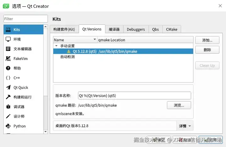 我的qmake位置如下(cmake不用配置,已自动检测到),刚刚编译的可以手动添加指定