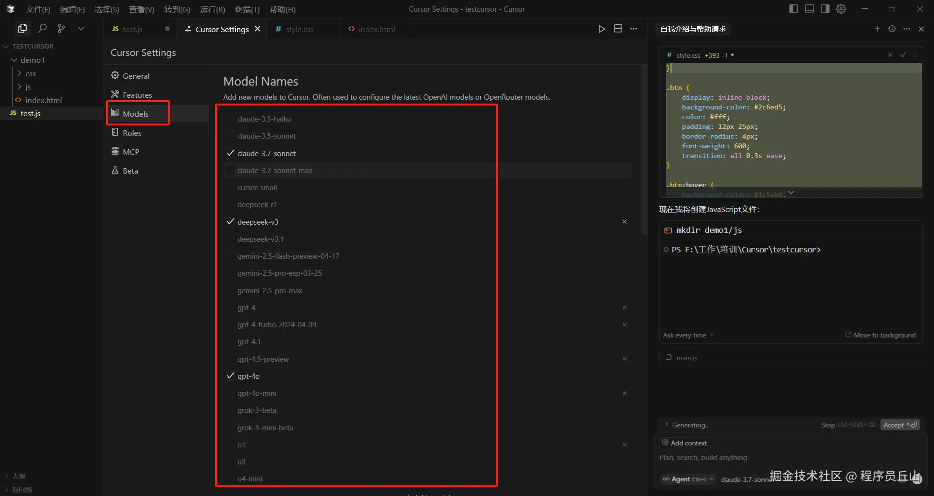 Cursor 内置近 20 个大模型,满足不同场景需求。通过设置进入 “Models” 页面,可选择预设模型或添加自定义模型。例如,GPT-4o 在综合问答方面表现更优,适合需求分析;Claude-3.7 在代码生成领域更出色,可根据任务类型灵活切换。需注意模型使用存在限量,需合理安排。
