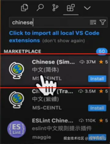 - 打开侧边栏的扩展商店,搜索 “Chinese”。