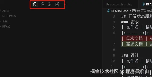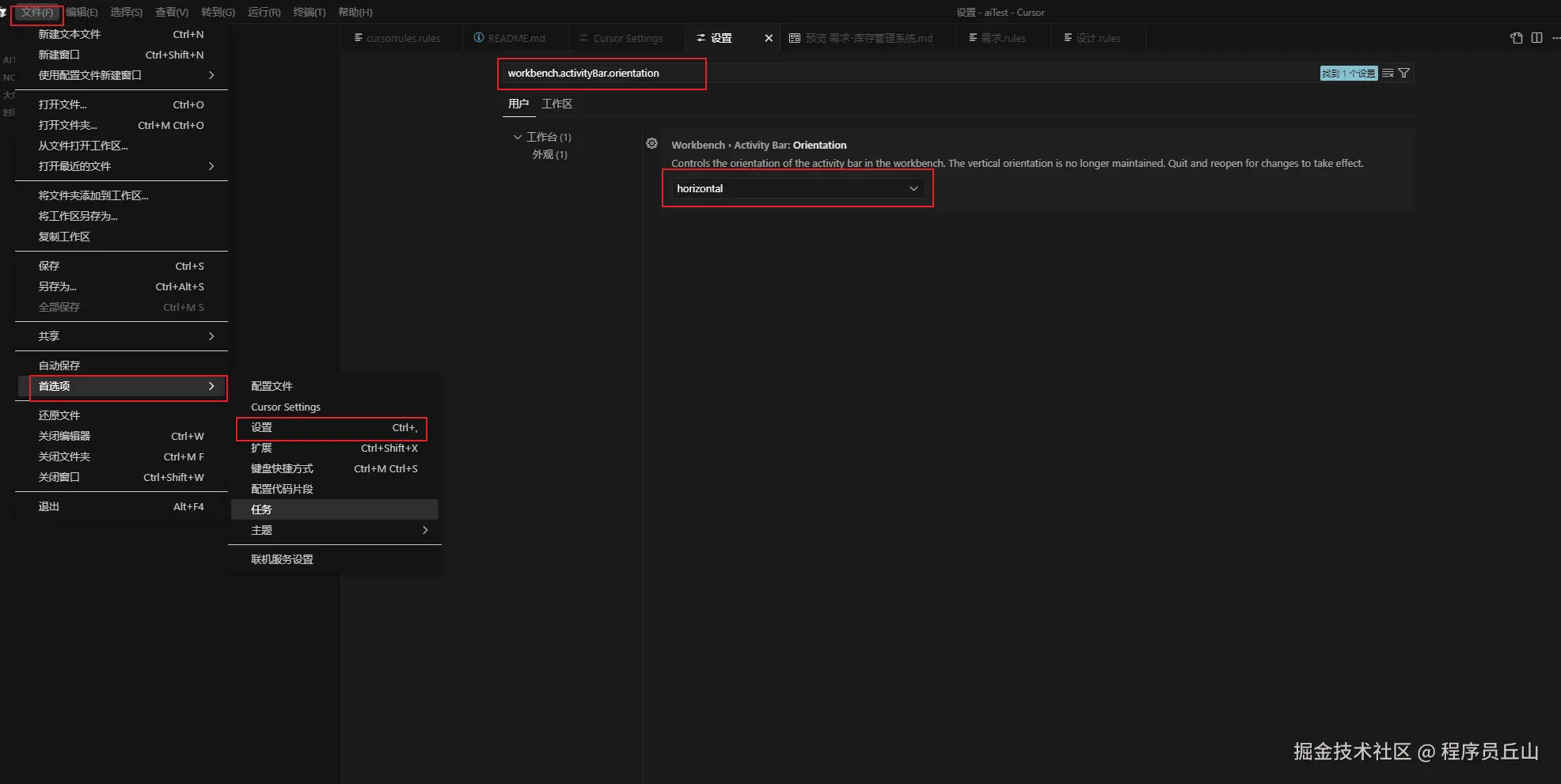 默认情况下,Cursor 的活动栏是水平放置的,这是为了节省空间,方便集成聊天功能。