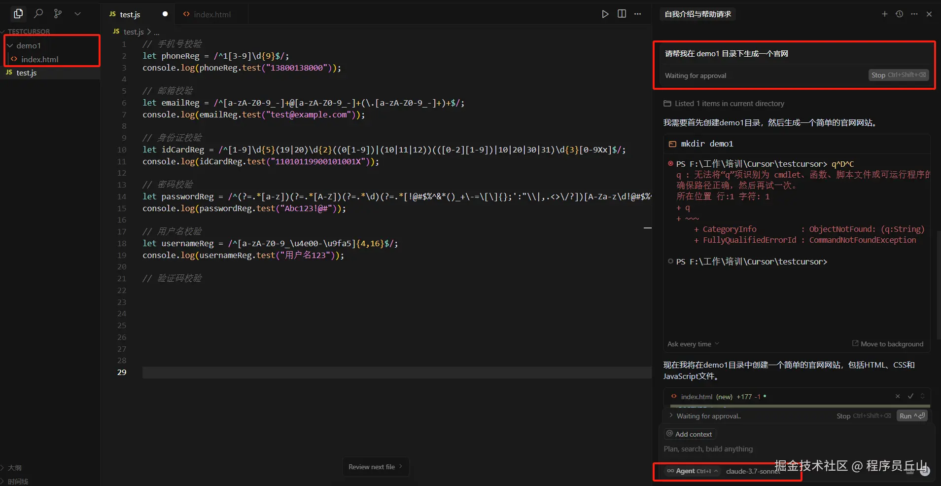 Agent 模式是 Cursor 的另一核心功能,不仅能回答问题,还能根据需求生成和修改代码,且无需离开当前工作流。例如,输入 “请帮我在 demo1 目录下生成一个官网”,Agent 会分析任务,创建目录并生成包含 HTML、CSS、JS 的简单官网代码。生成的代码可预览,用户可选择接受或拒绝,灵活控制代码生成流程,显著提高开发效率。