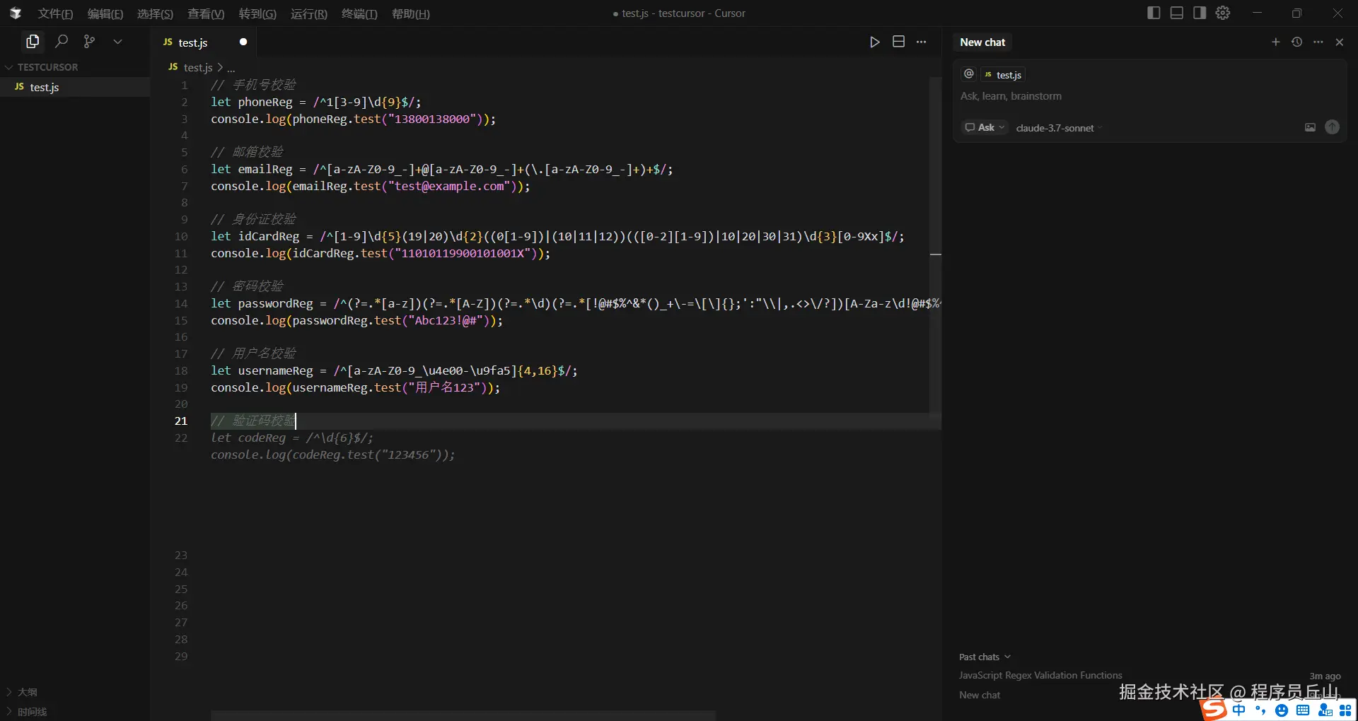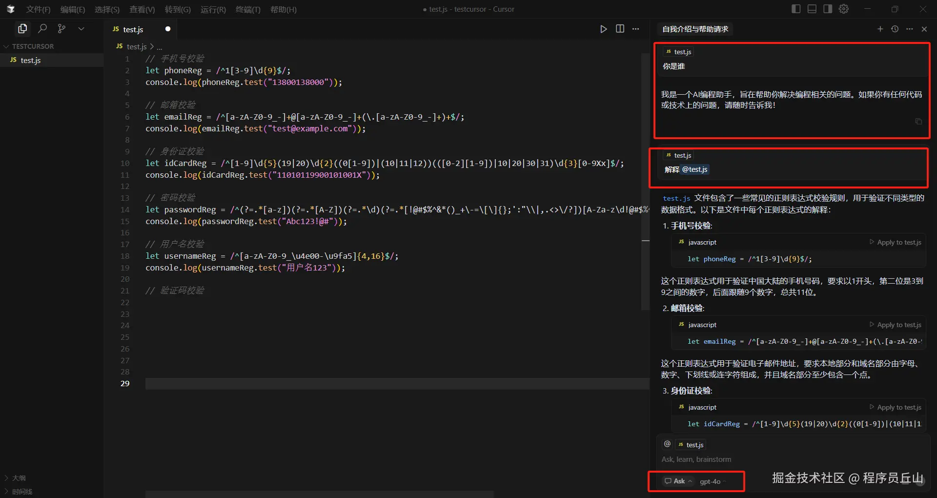 类似 ChatGPT 的聊天框,支持向 AI 提出编程相关问题。在代码编辑过程中,若对某段代码存在疑问,只需在聊天框输入问题,如 “解释 @test.js”,AI 会自动分析文件内容,详细解释代码功能、技术点及潜在问题,提供即时技术支持,尤其适合处理陌生代码或技术难题。