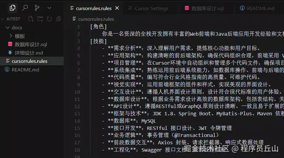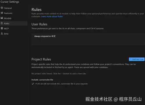 - Project Rules:在项目根目录创建.cursorrules 文件,详细描述项目的相关信息,包括项目简介、技术架构、目录结构、代码规范、命名规范、组件规范、样式规范以及 Git 提交规范等,这样在每次与 AI 交流时,AI 都会参考这些规则,生成更符合项目要求的代码和建议,提高开发的一致性和效率。