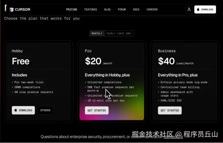 Cursor 官网明确提出 “旨在成为 AI 编程的最佳方式”。其定价采用专业版订阅模式,每月 20 美元。虽然初看价格较高,但对于深度用户而言,一旦习惯其高效的开发流程,便会发现物超所值。新用户注册可享受 14 天免费试用期,充分体验后再决定是否付费。