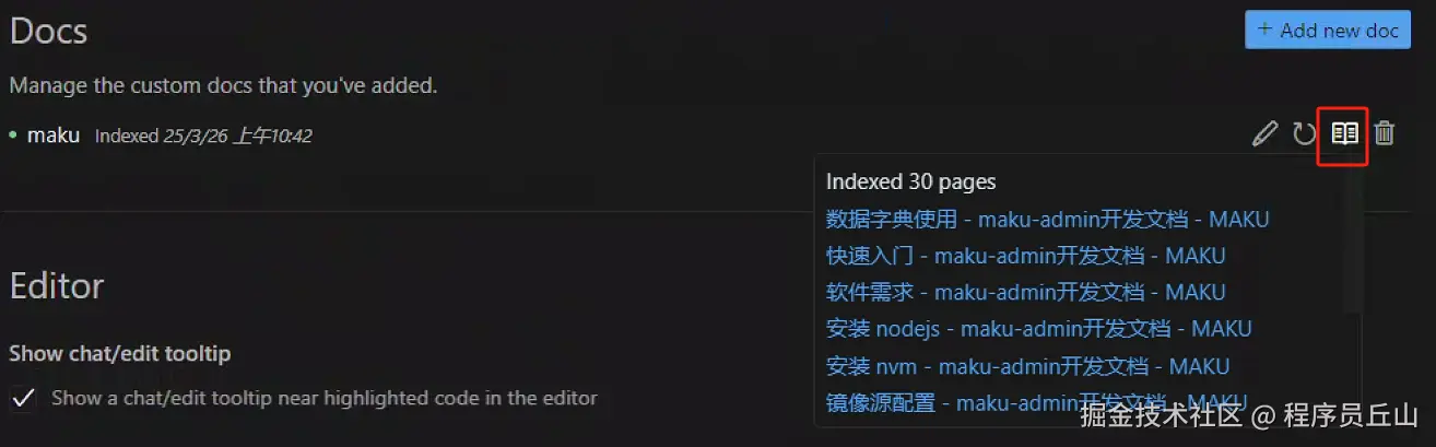 - 4. 在使用时,在输入框中输入 @,选择 Docs 并选中要引用的文档,随后跟上相关指令,Cursor 就能依据文档内容给出回复。