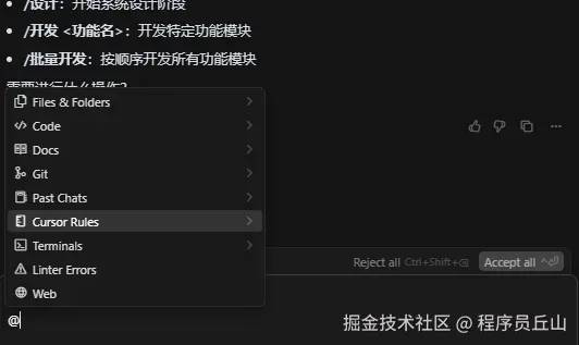 在 Cursor 中,@符号是一个强大的交互工具,能够帮助用户更高效地与 AI 进行交互。在任何 AI 交互场景,如聊天窗口或终端中输入 @,会触发上下文关联菜单。该菜单会自动过滤并推荐当前项目中最相关的资源,包括文件、代码片段、文档等。