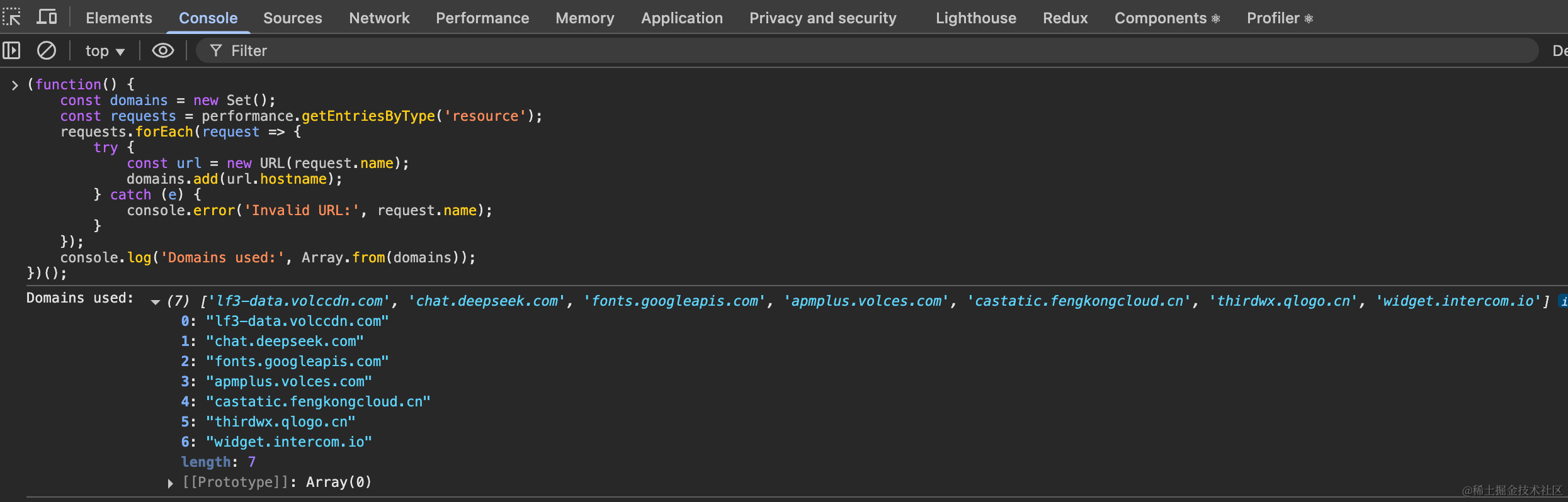 将以上代码复制并粘贴到开发者工具的控制台中运行,你会在控制台中看到所有请求的域名列表。
