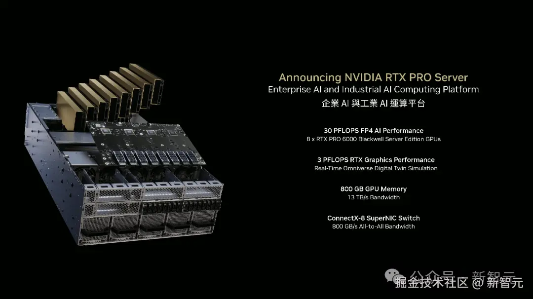 全新 RTX PRO Server:搭载 8 块 RTX PRO 6000 GPU 和 800GB 显存(13TB/s 带宽),可提供 30PFLOPS 的 FP4 AI 算力和 3 PFLOPS 的 RTX 图像算力