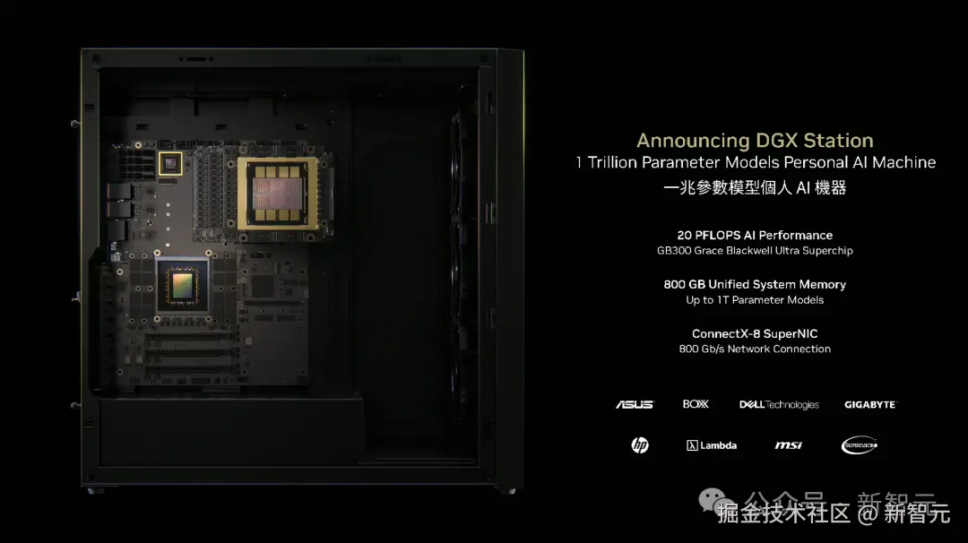 DGX Station:搭载 GB300 超级芯片和 800GB 统一内存,可提供 20PFLOPS 的 AI 算力